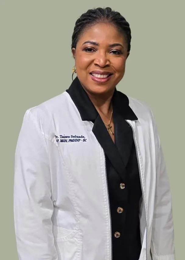 With over 25 years of experience in clinical and administrative settings, Dr. Taiwo Soluade is a highly skilled Psychiatric Mental Health Nurse Practitioner (PMHNP-BC). She is dedicated to delivering expert psychiatric care to patients across diverse backgrounds, specializing in treating mood disorders, anxiety, PTSD, substance use disorders, and more.